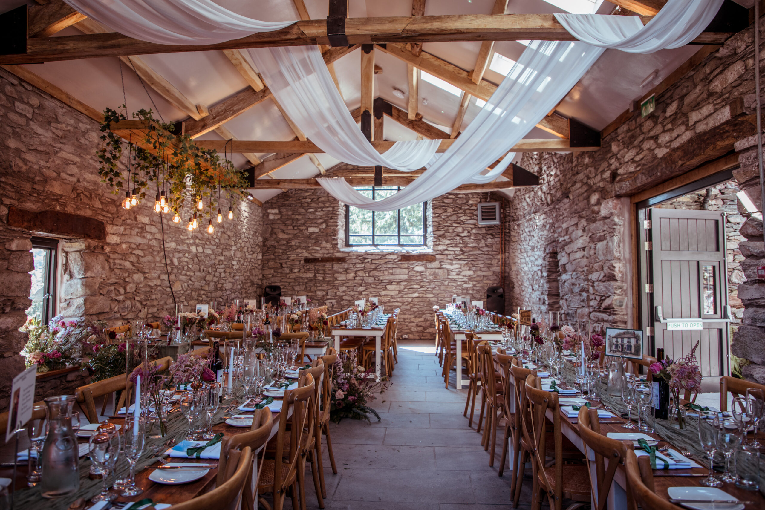 Our beautiful Grade II listed Lakeland barn has been lovingly restored and is a fabulous versatile space, just waiting to be transformed with your unique personality and vision. With its exposed wooden beams, open-plan layout and fabulous fell views, it offers an idyllic setting for your dream Lake District wedding. It’s the perfect venue for your wedding ceremony, wedding breakfast and post wedding party!